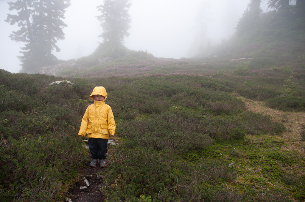 There had been other ways to get past the ledge. None of them were great, but there were choices. I could have backed off further, divided up the backpack, enlisted Kyle’s help in a reasoned and proactive manner. I could have picked my way along the slope I was now racing down on my tummy. We could have tried to do something with our rope. There were a lot of choices that I didn’t take, because at 8 hours in you tend to go with whatever looks best at first glance. It’s actively dangerous to stand around searching for perfect ways to do things, because energy (and daylight) are so finite. I thought I could make it in safety, so I took the chance. Usually things work out, and in fact they still worked out. I skidded to a halt, and Kyle ran up to me, shouting apologies into the rain. He got the backpack up, confirmed that Ryan was intact. My son was crying freely, so Kyle held his hand. Ryan says it was this moment when he started to feel happy again, out there on the bitter edge of the north shore mountains. As for me, I crouched with my legs hugged to my chest, staring out into the fog. The aftermath was hitting, and I had to be strong. I hid the tremors from my son, let them go into the wind. I didn’t know then if I was capable of walking, let alone carrying him another 10 kilometers out. And I felt so bad about it, like I had stepped into the path of a car while holding his hand. Like I had really messed up, despite trying so hard. Messed up not because I fell, but because I had allowed myself to reach a place where falling was so easy. I came with nothing to prove, I didn’t visit these parts to learn how hardcore a dad I am. I just want to show him the world.